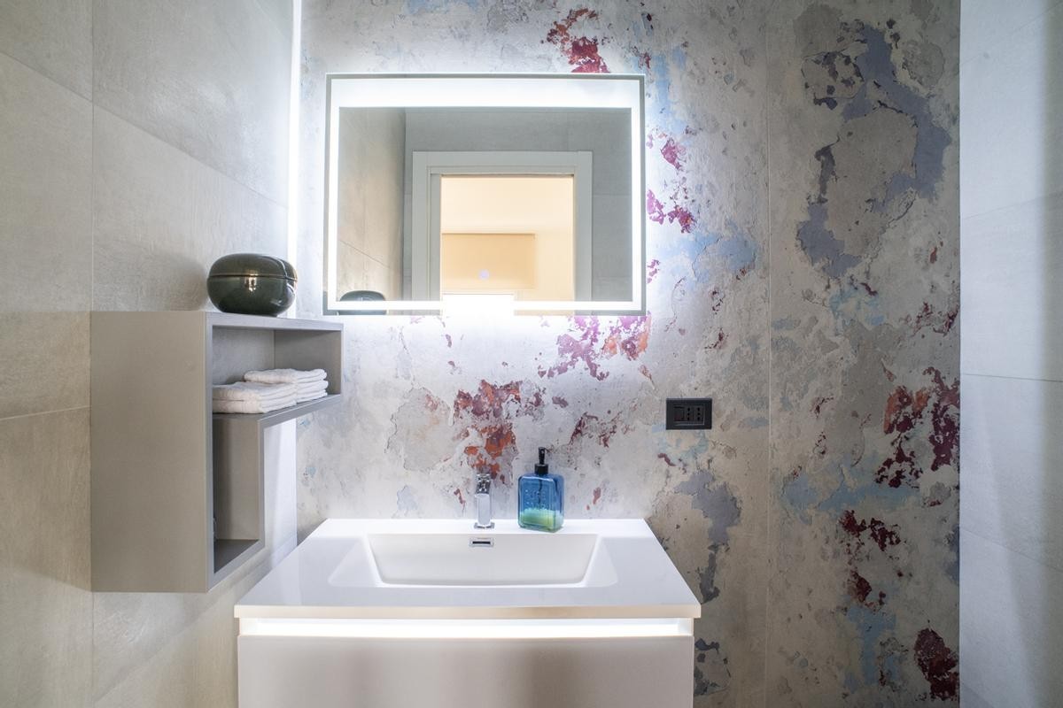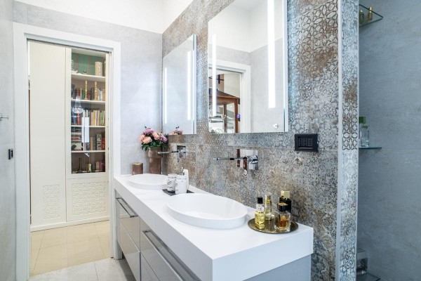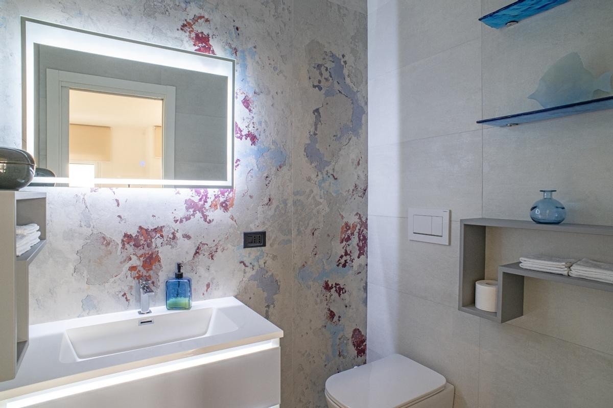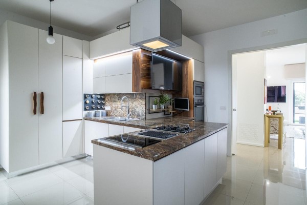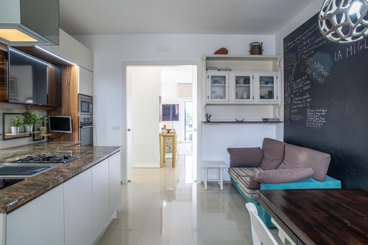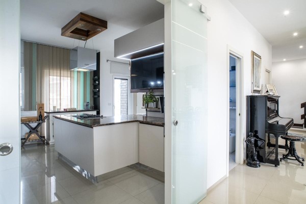 La cucina, moderna e funzionale, è realizzata con materiali di alta gamma, soluzioni su misura e isola centrale, mentre i bagni presentano rivestimenti di design, sanitari sospesi e box doccia walk-in, contribuendo a un’atmosfera elegante e contemporanea.