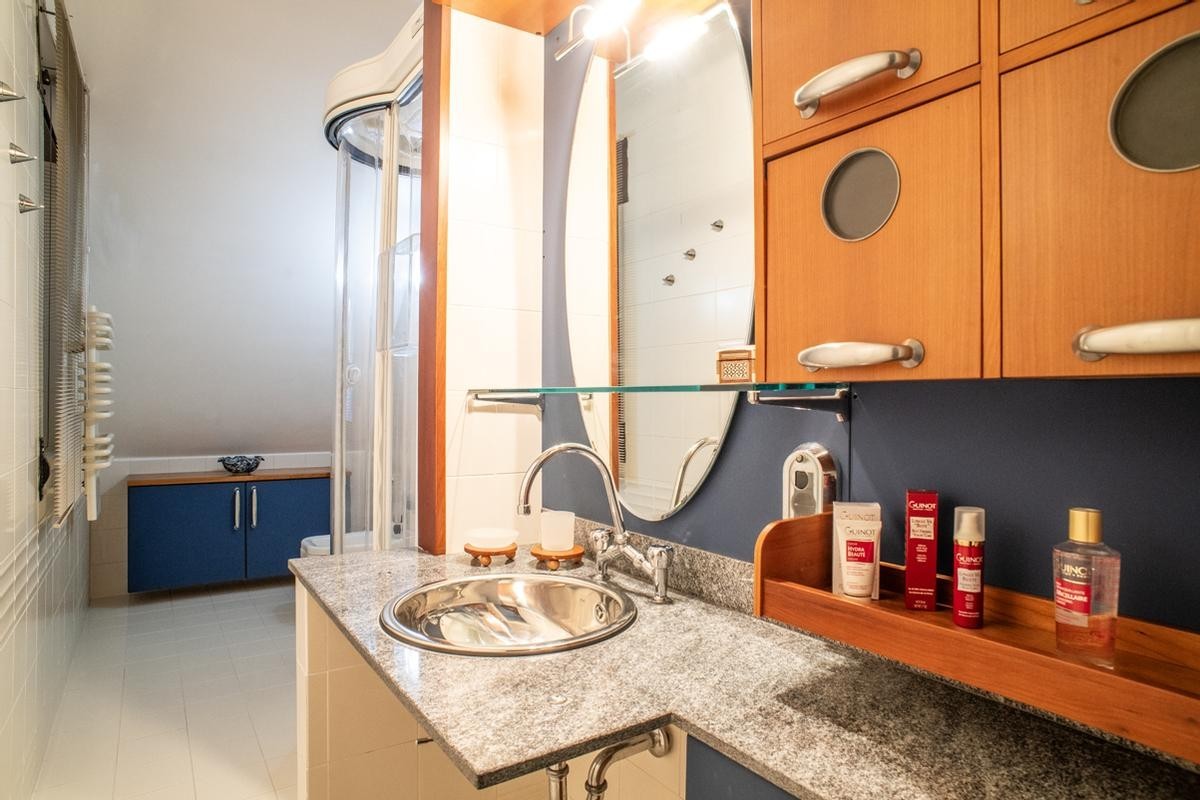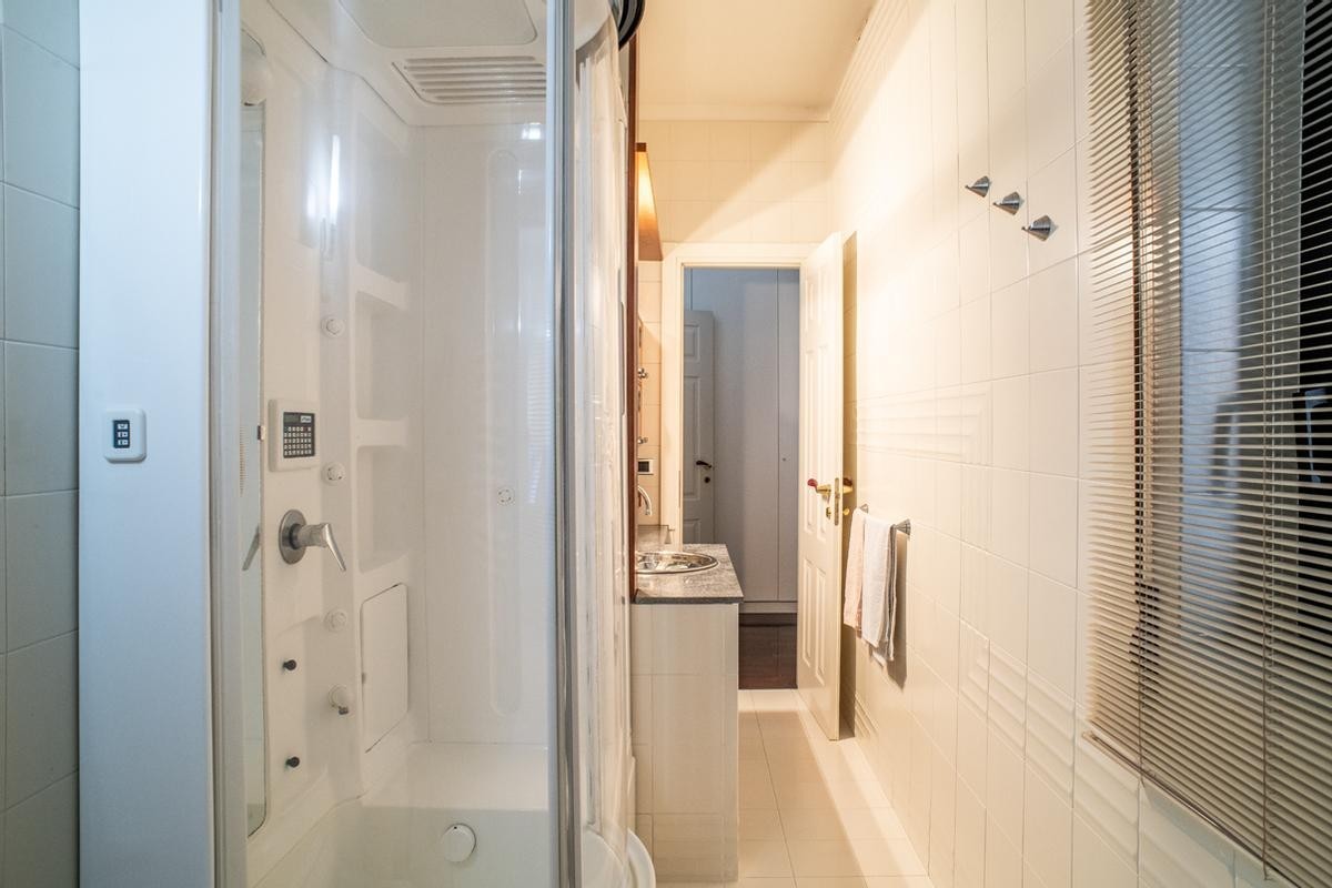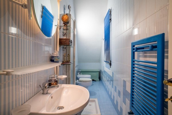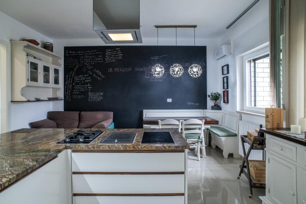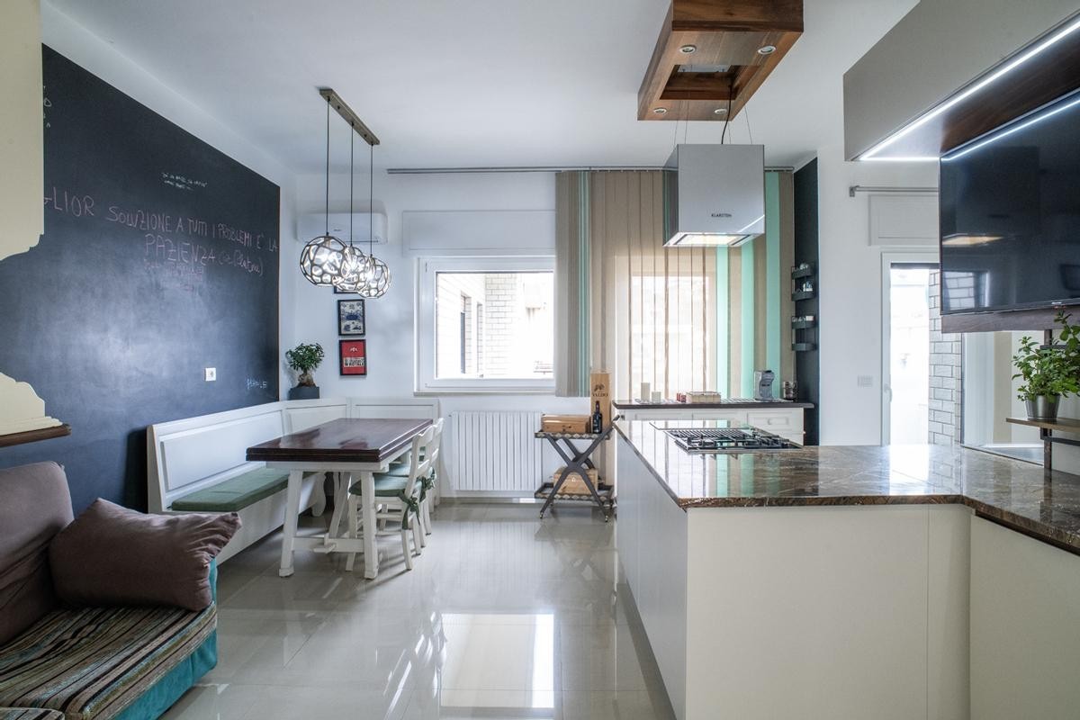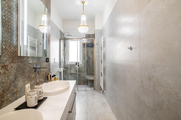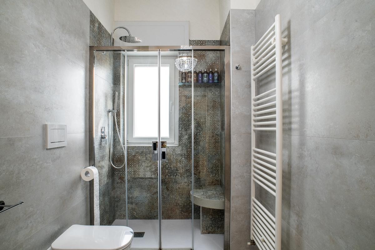 La cucina, moderna e funzionale, è realizzata con materiali di alta gamma, soluzioni su misura e isola centrale, mentre i bagni presentano rivestimenti di design, sanitari sospesi e box doccia walk-in, contribuendo a un’atmosfera elegante e contemporanea.