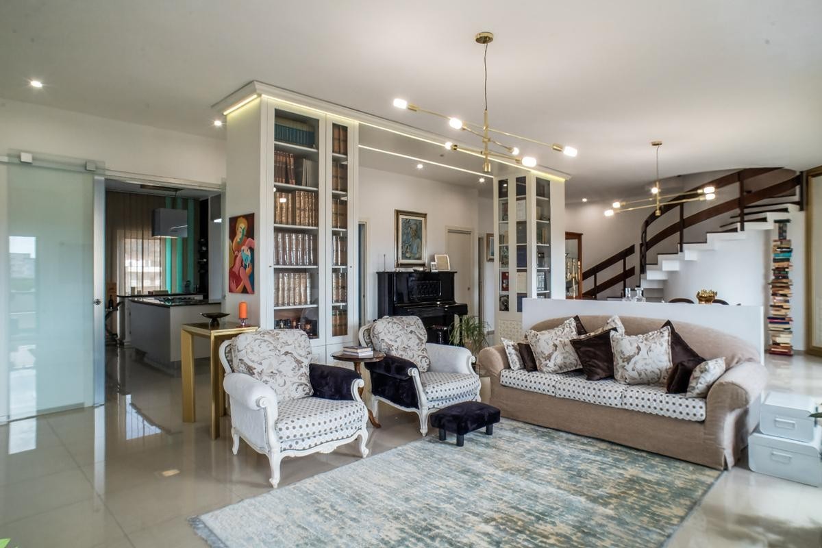 Il cuore della casa è la raffinata zona living, con grandi volumi, affacci esterni e una continuità armonica tra gli spazi, ideale sia per la vita quotidiana che per ricevere con eleganza.