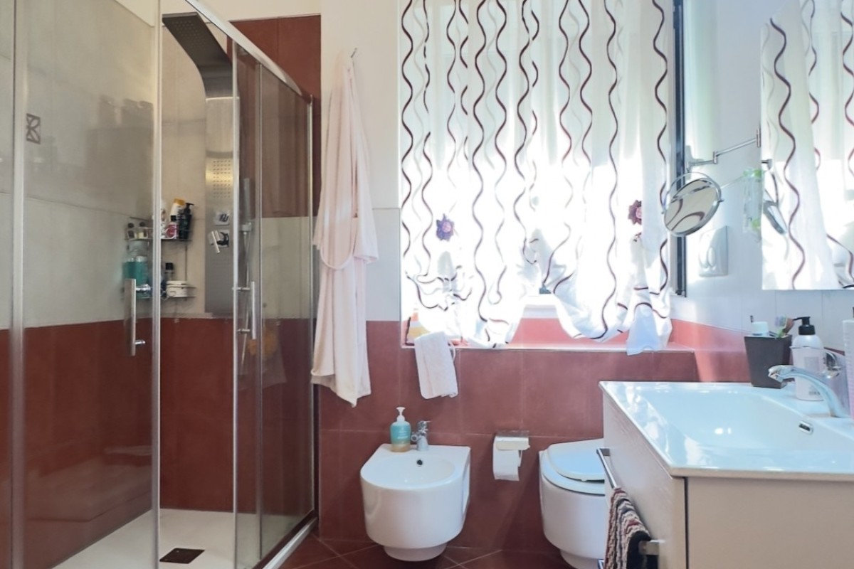 La zona notte, ben separata, comprende tre camere da letto di generose dimensioni, una con bagno privato, oltre a un bagno principale dotato di ampia cabina doccia.