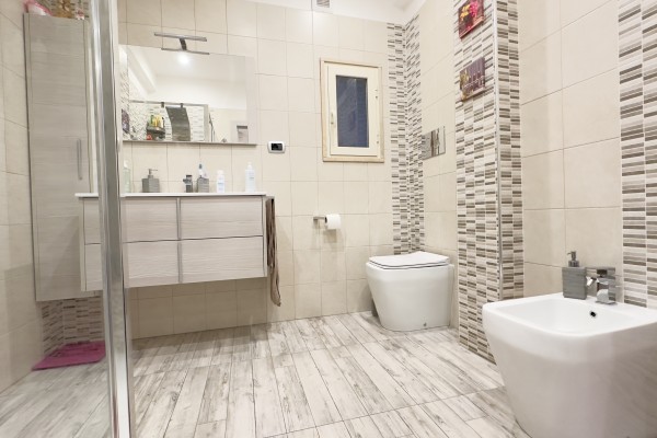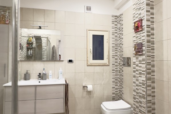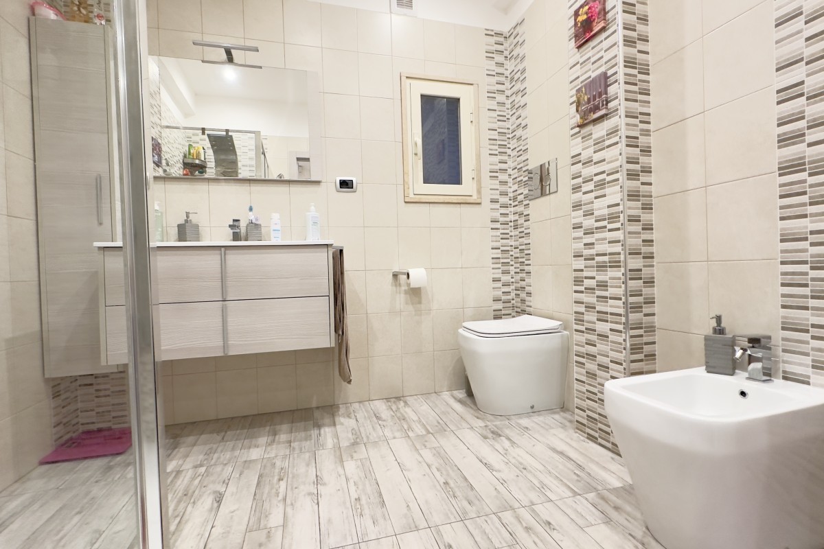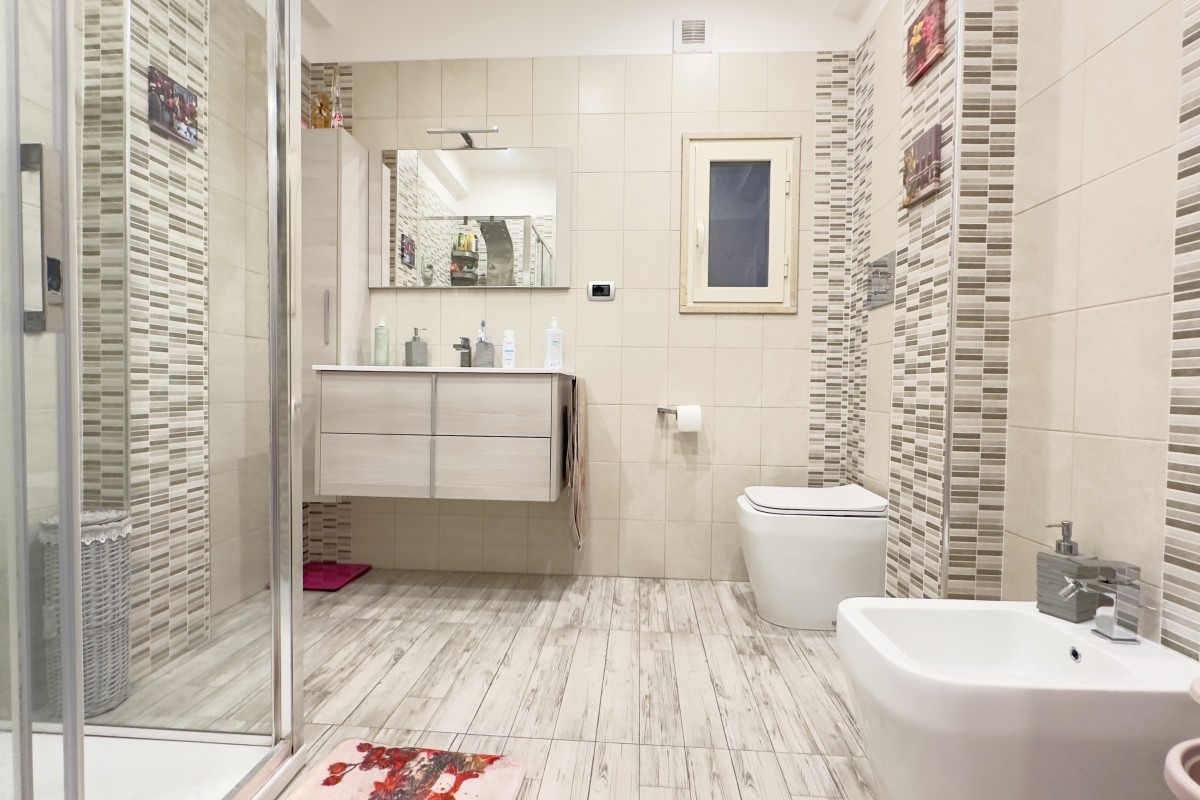Il bagno, elegante e funzionale, è dotato di una grande cabina doccia.